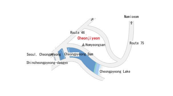 This is a reservoir from the nation ' s first pump-type generator, and together with the magnificent views of Homyeongsan (Mt.), the vast reservoir offers beautiful scenery that resembles the crater lake of Mt. Baekdu . Take a bus from Gapyeong-eub and get off at Sanyu-ri or at Sangcheon Station in Cheongpyeong-myeon and hike to Homyeong Lake to enjoy the scenery. The long canyons extending from mountains are also excellent resting areas, in which can be enjoyed by hiking. The view of Cheongpyeong Lakeside from Palgakjeong at Homyeong Lake is also breathtaking. The Sangcheon fishing pier in the middle of the canyon provides enjoyment for fishing enthusiasts as well.