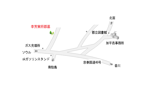 L李芳実将 (? ~ 1362 恭愍王 11 年 ) は高麗後期の武臣で、 忠穆 王 が元国にいた時代に王に仕えた功により、王が即位すると 中郞 将 になり、恭愍王 3 年 (1354) に大護軍となって 宣城 で民乱を起こした 達魯花赤 と 魯 連 祥 の親子 を押えた。恭愍王 8 年 (1359) に 僞平章 、 毛居敬 などの紅巾賊が 4 万の兵力を従えて 宜州 、 睛州 、 麟州 などを落とした後、 麟州 を 雄拠すると 安遇 、 利音 、イ・インウなどと共にでこれらを撃退した。紅巾賊撃退の功により推誠協輔功臣になった後 樞密院副使 に上がった。 1362 年 摠 兵官 鄭世雲 、金得 培 、 安遇 、 安遇慶 、崔 瑩 、李成桂などと共に開京を収復するなど大きな功を立てて 中書侍郞平章事 に上がったが 金 鏞 、 朴椿 の謀略によって 安遇 や 金得 培 などと共に殺害された。 封墳の周りには護石がかけられ上石が置かれており、その前に香石が置かれて両方には文官石を置き、その前に望柱石を列べた。封墳に向かって右には 1978 年に哲学博士イ・ウルホが褒め称えて、キム・チャンドンが書いた『高麗元帥忠烈公李芳実之墓』神道碑が立てられている。