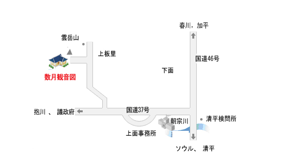 懸燈寺 数 月観音図は 20 世紀のもので、珍しく黒い背景に金銀泥で書かれたものだ。月を背景に中央に円形の二光の中に観音菩薩が奇岩怪石の上に遊戯者の姿勢で座っており、左右に精兵と柳、竹が描写されているが、このような形式は高麗後期の水月観音図の形式から借りて来たものだ。下には如意珠を持った竜王と善財童子、牌を持って遠遊冠をかぶった帝王がいて、空と水の境界の部分には中段に雲を水平に区切って四天王像を配置した。上には分身化した観音菩薩たちが柔軟な姿勢を見せている。月と水を背景で黒い背景に金泥と銀泥を相互に使ってつくられ、当時は華やかであったものと見当がつく。この 数 月観音図は 20 世紀につくられたもので珍しい図相を見せている。 数 月観音図の全長は 180cm 、幅 240cm である。