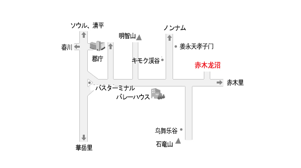 京畿道最北端の 道馬峙 渓谷 と呼ばれる所で、加平赤木里方面の市内バスの終点である竜水洞村で 3 ・ 8 橋を渡って無人の谷をずっと上っていくと路辺に沿って続く渓谷の珍景に見とれてしまう。 ここは環境庁が告示した道内唯一の清浄地域で天然記念物であるヨルメギが棲息している。 3 ・ 8 橋から上流へ 3km 行った地点には竜沼という沼があるが、水が深くて清明だ。竜が昇天していたところを妊娠した女性が見つけて竜は落ちて怪我して沼ができたという伝説がある所だ。 竜沼を経て 1 時間ほどずっと上っていくと大小の滝や沼が整然と並んでおり、遂に巨大な滝に着けば昔武官たちがナムルをおつまみにして酒を飲みながら踊って楽しんだという伝説にちなんだ武酒菜滝があるが、景観が秀麗で真夏でも寒さを感じるほどの所だ。